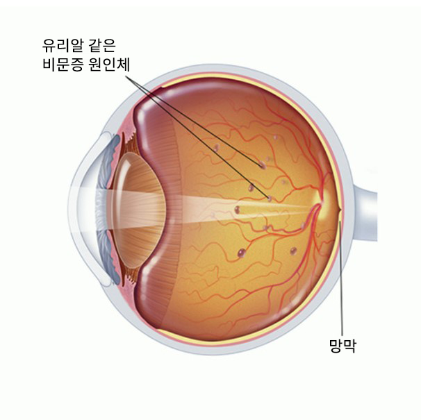 투명한 젤리 같은 물질에 혼탁이 발생하여 나타나는 질환입니다.