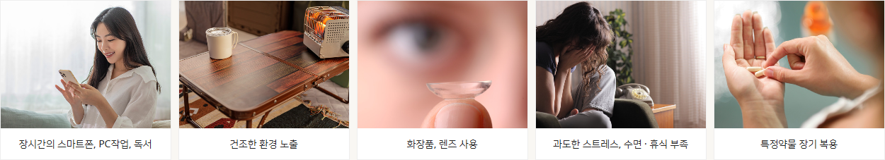 다양한 환경적인 요인과 눈물생성의 부족, 눈물증발의 증가(마이봄샘 기능저하)로